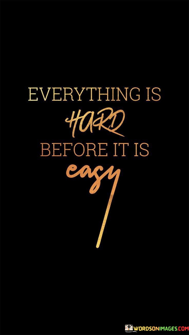 This quote, "Everything Is Hard Before It Is Easy," carries a straightforward message: when we first start something new or face a challenge, it often feels difficult and intimidating. It's like taking the first step on a steep hill; it requires effort and determination. However, as we persist and learn, what was once tough gradually becomes more manageable.
