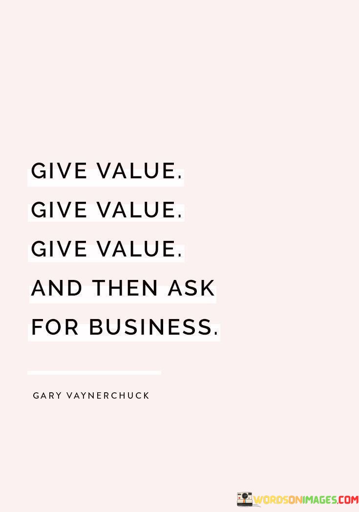 The quote "Give value, give value, give value, and then ask for business" is a fundamental principle in sales and business relationships. It highlights the importance of establishing a foundation of trust and providing something of worth to potential customers or clients before making any business requests or pitches.