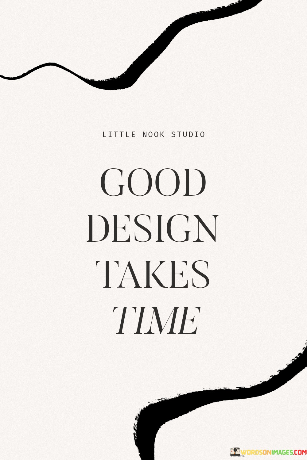 The quote "Good design takes time" highlights the importance of patience and careful consideration in the creative process. It emphasizes that creating something of high quality and aesthetic value cannot be rushed. Instead, it requires a deliberate and unhurried approach.