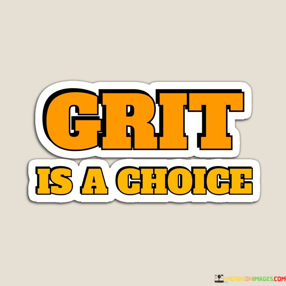 The quote "Grit Is A Choice" emphasizes that having determination and perseverance, which is often referred to as "grit," is something you can choose to develop and embrace in your life. It's like deciding to pick up a tool from your mental toolbox.