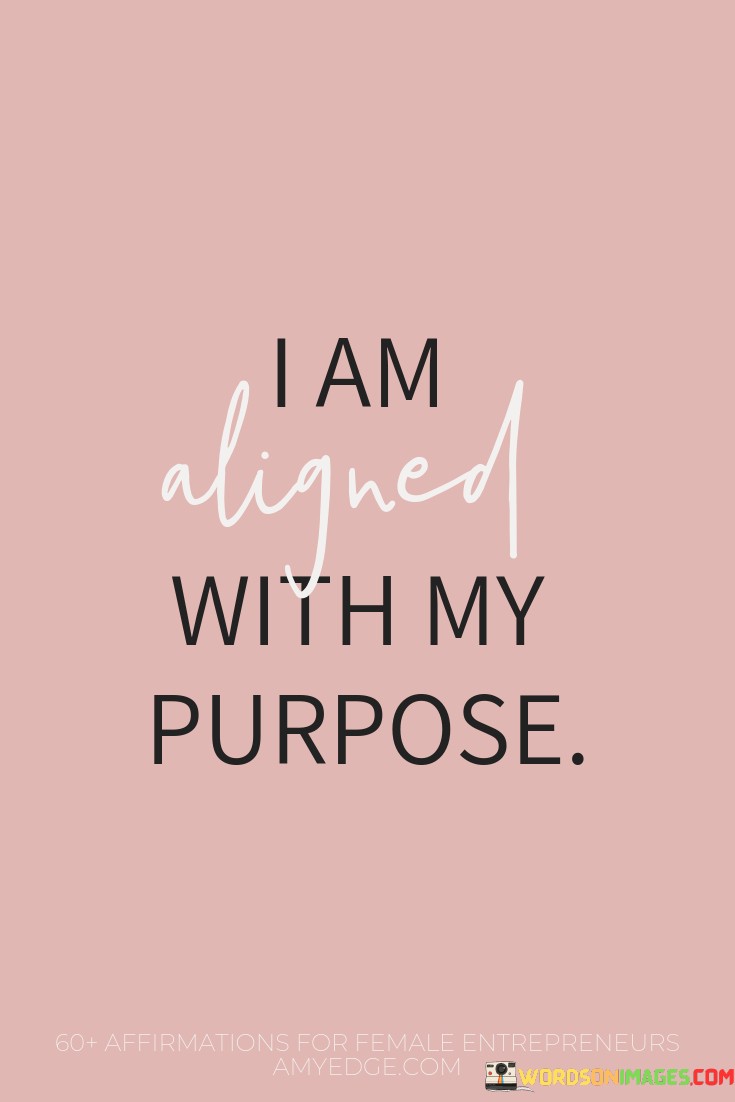 This quote, "I Am Aligned With My Purpose," means that the person who said it feels like they are on the right path in life. They believe that they are doing what they were meant to do, and it gives them a sense of direction and fulfillment. It's like they have found their true calling or mission in life.