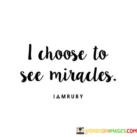 The quote "I Choose To See Miracles" means that the person decides to look for and believe in wonderful and amazing things happening around them. It's like making a conscious decision to focus on the positive and beautiful aspects of life instead of dwelling on the negative or difficult parts.