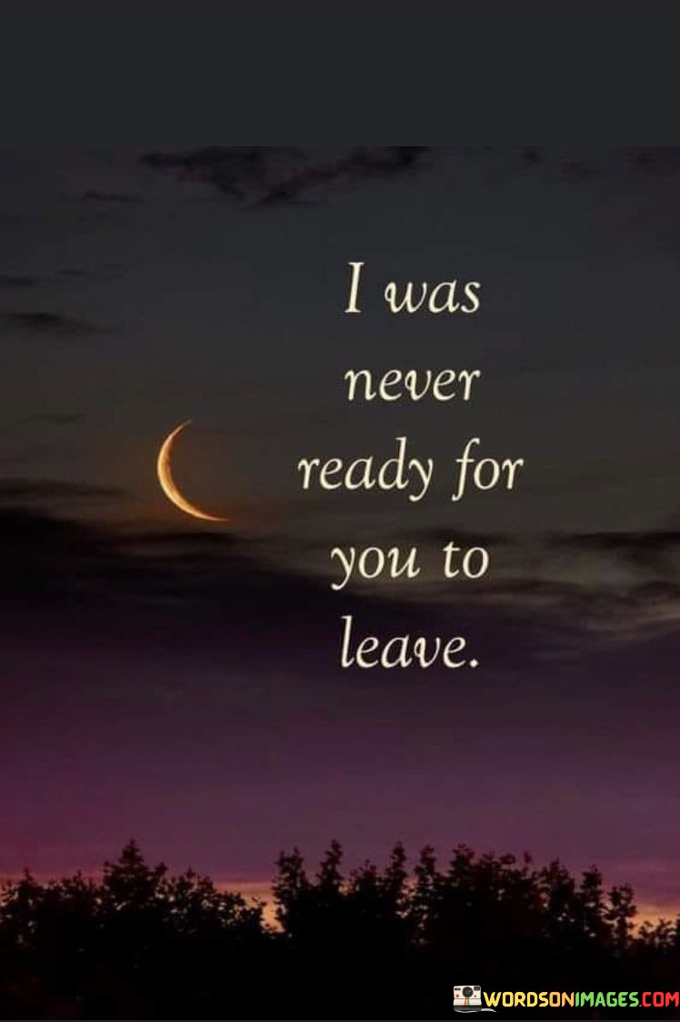 This quote expresses the feeling of sudden loss and unpreparedness when someone dear departs. It's like when you're not expecting a rainy day, and it pours unexpectedly. When someone says, "I Was Never Ready For You To Leave," they're saying they didn't see it coming, like a surprise goodbye. It's like the ending of a good book that you wish had more pages.