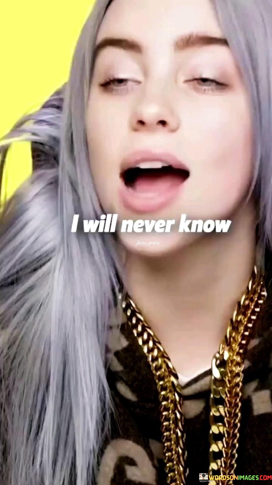 This quote can serve as a reminder of the importance of humility and open-mindedness in our pursuit of knowledge. It encourages us to be curious and inquisitive while also acknowledging that there will always be more to learn and discover. It emphasizes the beauty of the unknown and the wonder that comes with embracing the mysteries of life. Ultimately, "I will never know" invites us to approach the complexities of existence with a sense of awe and respect for the vastness of what we don't yet understand.