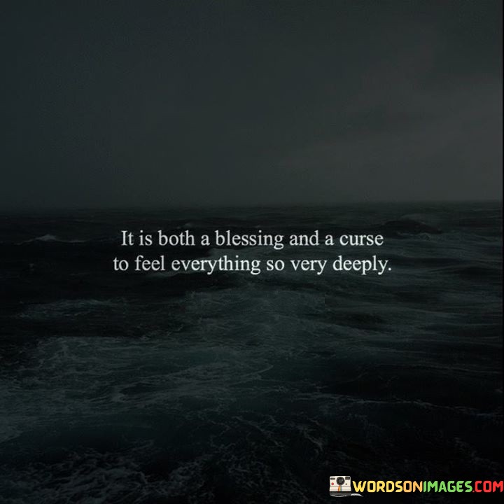 This quote captures the dual nature of experiencing emotions intensely. It suggests that feeling emotions deeply can be both a blessing and a curse, highlighting the complex and sometimes contradictory nature of such heightened emotional sensitivity.