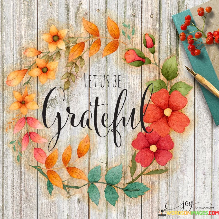 To "Let Us Be Grateful" means to consciously choose gratitude as a way of life. It involves recognizing and acknowledging the abundance in our lives, both big and small, and expressing gratitude for them. It reminds us to be thankful for the people who support and love us, the opportunities that come our way, and even the challenges that help us grow.