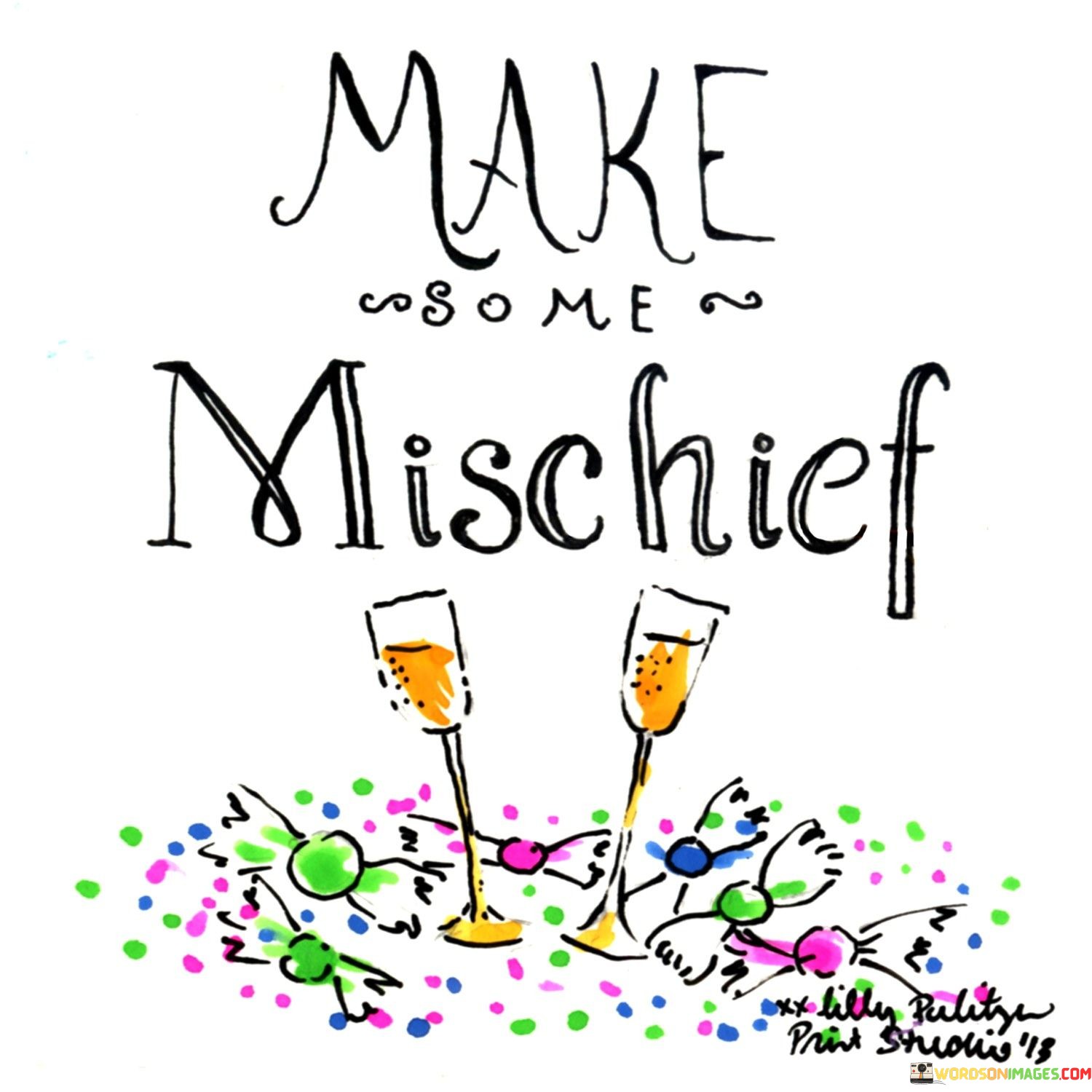 Creating a little chaos or trouble, that's what "Make Some Mischief" suggests. It's like adding a pinch of excitement to life, not necessarily causing harm, but just some harmless fun. Imagine kids playing pranks on April Fools' Day; that's mischief. It's about doing things that make you giggle without causing any real harm.
