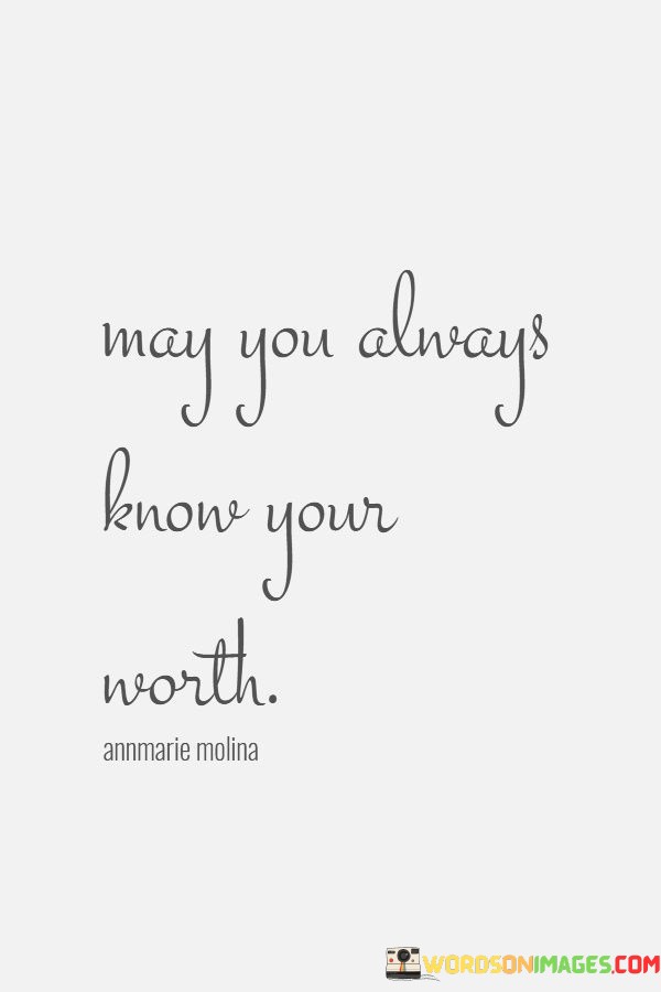 The quote "May You Always Know Your Worth" carries a heartfelt message of self-value and self-esteem. It expresses the hope that an individual will have a deep and unwavering understanding of their own importance and intrinsic value. This sentiment is a reminder that each person is inherently valuable and deserving of respect and love.