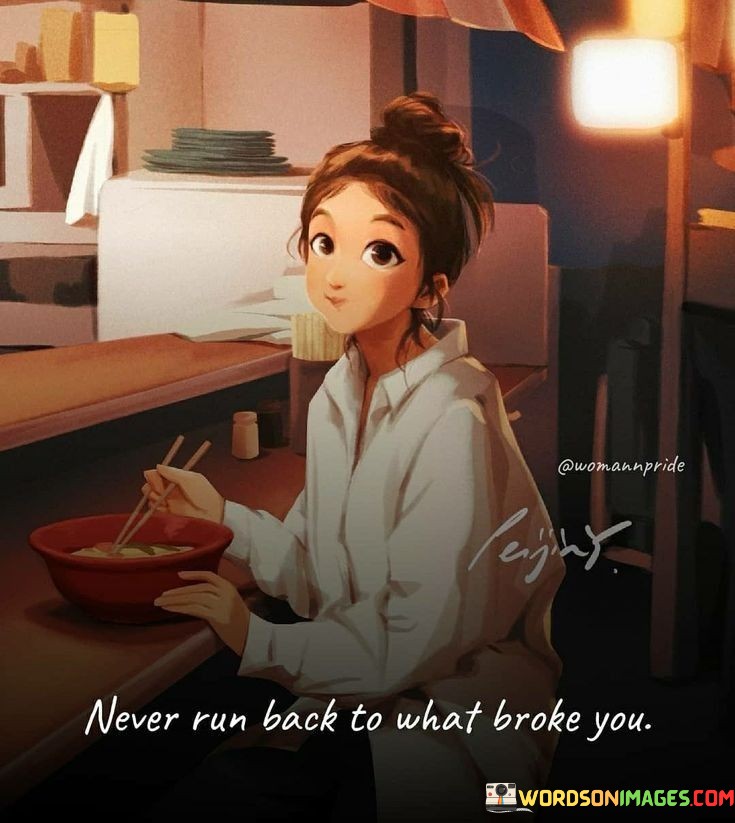 In summary, this quote reminds us that it's wise to avoid going back to things or situations that caused us pain or harm. Instead, we should seek new, positive experiences that can help us heal and grow. Just like avoiding a hot stove after getting burned, staying away from what broke us in the past is a smart choice for our well-being.