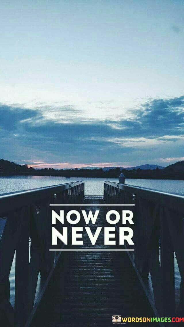 In a world of constant change, "Now or Never" underscores the impermanence of opportunities. It's a call to break free from procrastination and embrace the moment's potential. Whether it's pursuing a dream, expressing your feelings, or making a life-altering choice, this phrase serves as a powerful reminder to grab hold of the opportunities that come our way, as they may not return. Ultimately, it serves as a motivational mantra to live life with purpose, passion, and a sense of immediacy, pushing us to act boldly and decisively to achieve our goals and fulfill our desires.