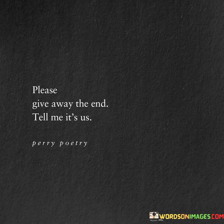 The quote "Please Give Away The End Tell Me it's us" seems to convey a desire for a meaningful connection or relationship. It suggests a longing for someone to be open and honest about the future, to reveal their true feelings, and to confirm that there is a shared bond between "us."
