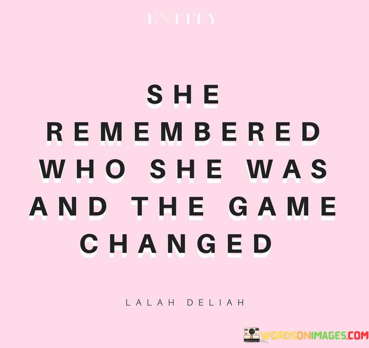This quote, "She Remembered Who She Was And The Game Changed," highlights the transformative power of self-awareness and self-identity. It suggests that when a person reconnects with their true self, it has a profound impact on their life and circumstances.