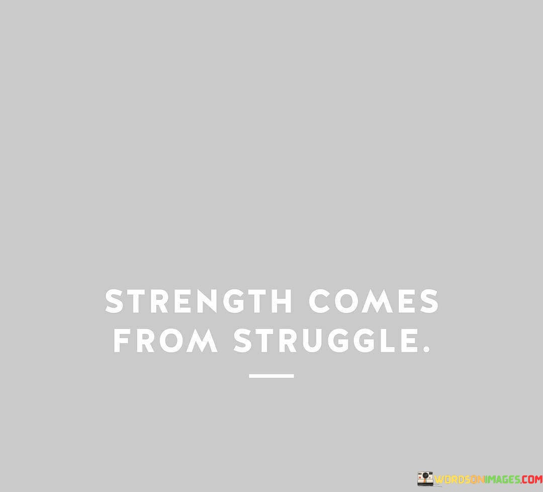 The quote "Strength comes from struggle" conveys the idea that challenges, difficulties, and hardships are the very experiences that build and enhance a person's inner strength and resilience. It suggests that facing and overcoming adversity is an essential part of personal growth and development.