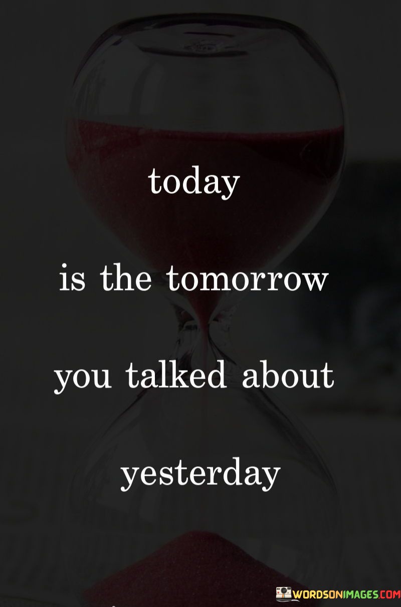 This quote, "Today Is The Tomorrow You Talked About Yesterday," serves as a gentle but impactful reminder of the importance of taking action in the present moment. It emphasizes that the aspirations and plans we discussed or dreamed about in the past are now the reality of today.