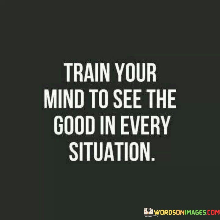 The quote "Train Your Mind To See The Good In Every Situation" emphasizes the importance of cultivating a positive and optimistic outlook on life. It suggests that our minds are like muscles that can be trained to focus on the positive aspects of any situation, no matter how challenging it may seem.