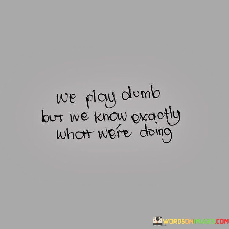 The quote "We Play Dumb But We Know Exactly What We're Doing" suggests that sometimes, people act as if they don't understand or are unaware of their actions, but in reality, they are fully aware and intentional in their behavior. It points to the idea that some individuals may feign ignorance to avoid taking responsibility for their actions or to manipulate a situation to their advantage.