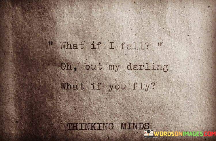The phrase "What if I fall?" reflects the common apprehension we all have when facing challenges or stepping out of our comfort zones. It acknowledges the fear of making mistakes or encountering setbacks on the path to our goals. However, the second part of the quote, "Oh, but my darling, what if you fly?" offers a contrasting perspective. It suggests that by taking that leap of faith and pushing past our fears, we might discover our hidden potential and soar to incredible heights.