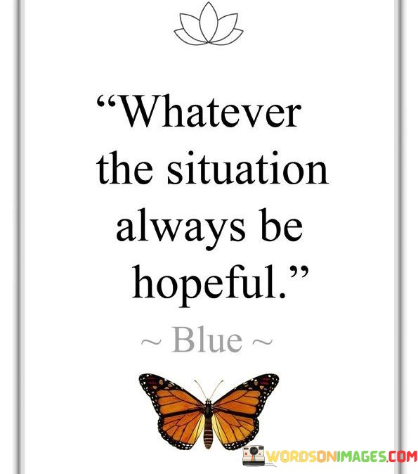"Whatever The Situation Always Be Hopeful" underscores the notion that hope is not just a response to favorable conditions; it is a conscious choice we can make every day. It reminds us that hope is a source of strength, an unwavering belief that no matter how challenging the circumstances may be, there is always a way forward. This powerful reminder encourages us to embrace hope as a guiding principle, helping us navigate life's ups and downs with grace and resilience.