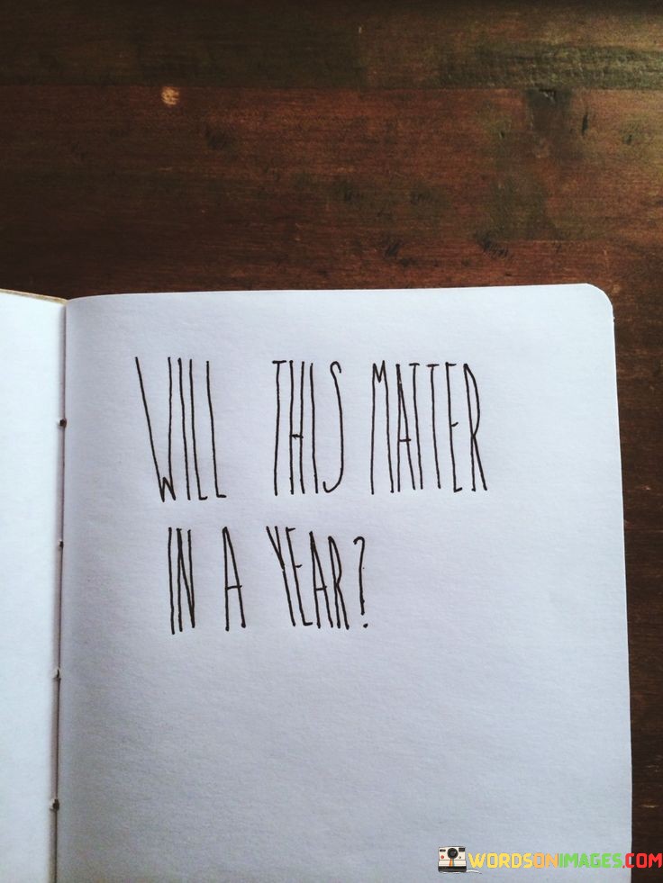 The quote "Will This Matter In A Year" urges us to contemplate the significance of our current worries and concerns. It prompts us to assess whether the issues we're facing today will have any lasting impact or if they will fade away with time.