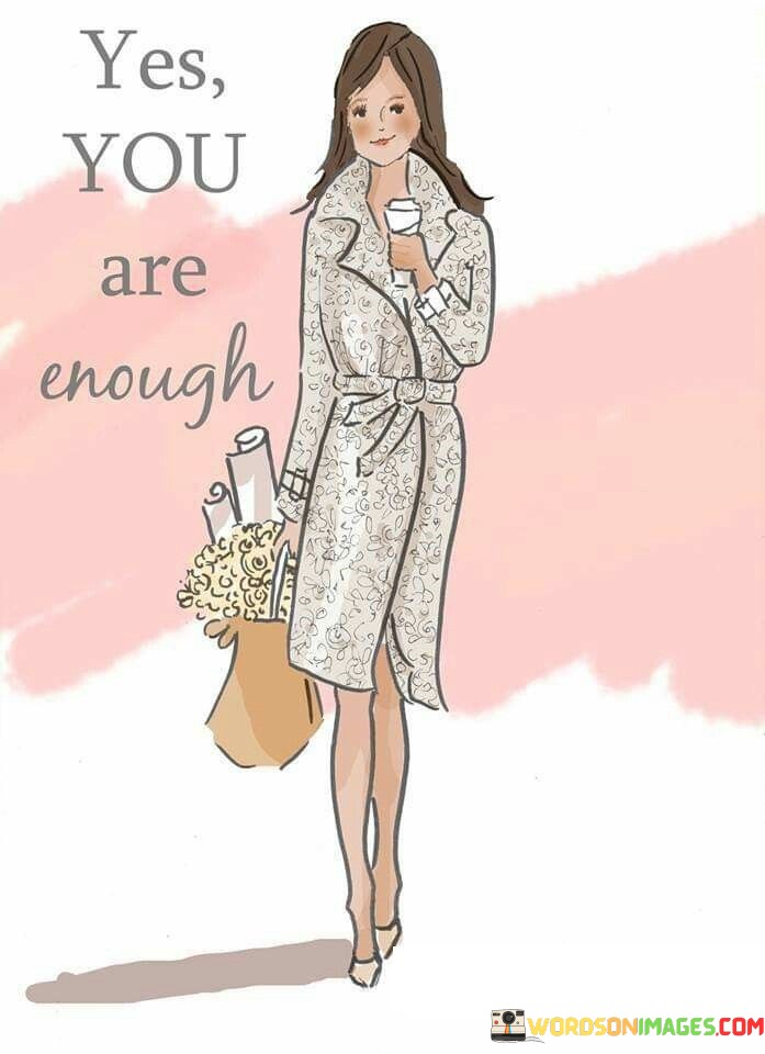 This quote promotes a positive and healthy self-image, encouraging individuals to recognize and embrace their unique qualities, strengths, and imperfections. It's a reminder that we should be kind and accepting toward ourselves, recognizing that our worth is not determined by external achievements or the opinions of others. Ultimately, "Yes You Are Enough" is a message of empowerment, inviting individuals to find contentment and confidence in their own skin and to acknowledge their self-worth without reservation.