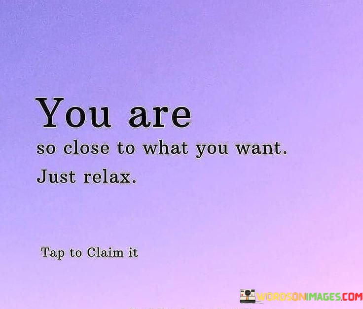 In this succinct yet profound quote, the message is clear: the attainment of one's desires is often just within arm's reach, and the key to achieving them lies in the art of relaxation. The phrase "You are so close to what you want" encapsulates the idea that our goals and aspirations are not distant dreams but tangible realities waiting to materialize. This notion can be incredibly reassuring, as it suggests that the sweat, tears, and effort we've invested in our pursuits have brought us right to the brink of success.
