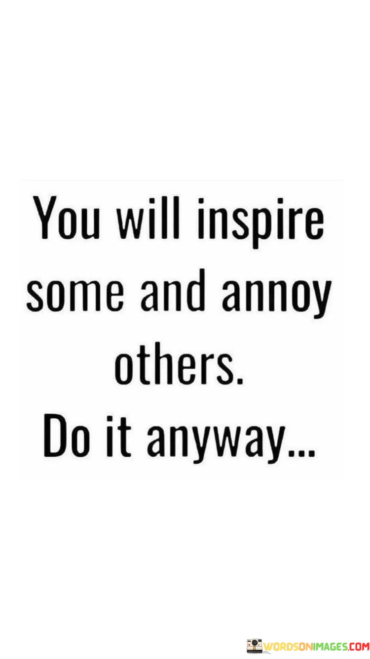 The quote "You Will Inspire Some And Annoy Others. Do it anyway" carries a valuable message about being true to oneself despite the varied reactions and opinions of others. It acknowledges that when we pursue our passions or make positive changes in our lives, there will always be a mix of responses from those around us.