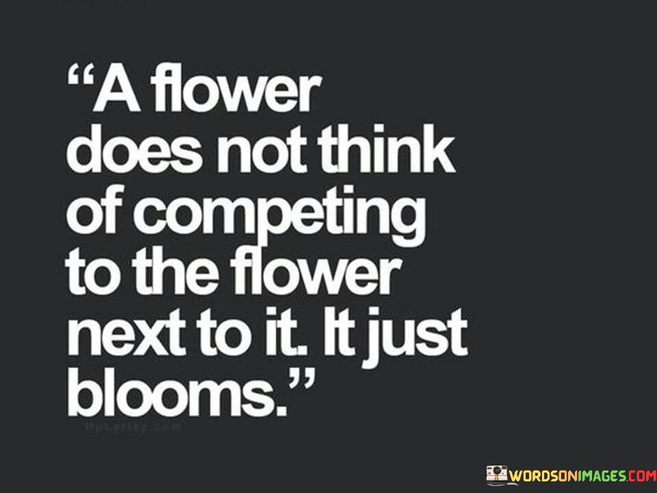 The quote "A flower does not think of competing to the flower next to it; it just blooms" encapsulates a profound lesson about self-acceptance, personal growth, and the beauty of embracing one's uniqueness. In this simple yet powerful analogy, the flower serves as a metaphor for human beings, urging us to focus on our individual growth and development rather than comparing ourselves to others. When a flower blooms, it unleashes its innate beauty and showcases its unique qualities to the world without any self-doubt or comparison. Similarly, when we embrace our true selves and acknowledge our strengths and weaknesses, we can authentically blossom and radiate our inner beauty. The quote encourages us to let go of the constant need for validation from others and the anxiety of measuring up to societal standards. Instead, it urges us to appreciate our distinct journey and celebrate our growth, no matter how different it may be from others. In a world consumed by the idea of competition and comparison, this quote serves as a gentle reminder that true happiness and fulfillment come from within. Just as each flower adds to the beauty of a garden with its unique colors, shapes, and fragrances, each individual contributes to the tapestry of humanity with their unique experiences, talents, and perspectives. By focusing on self-improvement and personal growth, we can nurture our inner selves and allow our authentic essence to bloom, unhindered by the opinions or successes of others. Moreover, the quote emphasizes the importance of appreciating the diverse and vibrant array of individuals around us. Instead of viewing others as rivals or threats, we should celebrate their growth and achievements, recognizing that their success does not diminish our own. Just as each flower in a garden adds to the overall beauty of the landscape, each person's unique qualities and accomplishments enrich the fabric of society. In essence, the quote "A flower does not think of competing to the flower next to it; it just blooms" encourages us to let go of the destructive habit of comparison and embrace our individuality. By nurturing our growth, embracing our uniqueness, and celebrating the successes of others, we can create a more compassionate and harmonious world. Like the blossoming flower, let us focus on our journey of growth, continually striving to become the best version of ourselves without being burdened by comparisons, and collectively add beauty to the garden of humanity.