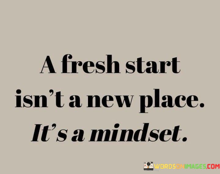 The quote, "A fresh start isn't a new place; it's a mindset," encapsulates a powerful message about the nature of renewal and personal growth. It suggests that the key to embarking on a new chapter in life is not necessarily physical relocation but rather a shift in one's perspective and attitude. While changing environments or circumstances can provide opportunities for a fresh start, the quote emphasizes that true transformation and renewal stem from within. It celebrates the significance of cultivating a positive and forward-looking mindset, one that is open to change, learning, and embracing new possibilities. By adopting a fresh mindset, individuals can break free from the constraints of their past and reframe their experiences, enabling them to approach life with renewed enthusiasm, resilience, and a willingness to embrace the unknown. Ultimately, the quote serves as a reminder that a fresh start is not dependent on external factors but lies within the power of an optimistic and receptive mindset, paving the way for personal growth and a revitalized sense of purpose. At its core, the quote celebrates the transformative power of a new perspective. It acknowledges that while external changes can facilitate a fresh start, the true source of renewal lies in the way individuals choose to perceive and respond to their circumstances. By embracing a positive and growth-oriented mindset, individuals can overcome past challenges, let go of limiting beliefs, and approach life with a sense of renewed vigor and curiosity. Moreover, the quote speaks to the importance of inner growth and self-awareness. A fresh start, as the quote suggests, is not about escaping from the past but rather confronting it with a newfound sense of resilience and optimism. By taking the time to reflect on past experiences and identify areas for personal growth, individuals can lay the groundwork for a fresh mindset that enables them to approach challenges with newfound strength and wisdom. Furthermore, the quote underscores the idea that change begins from within. External circumstances may provide opportunities for a new beginning, but the true transformation comes from embracing the potential for growth and self-improvement. By shifting their mindset and cultivating a sense of self-belief and empowerment, individuals can set themselves on a path of continuous renewal and personal evolution. In conclusion, the quote "A fresh start isn't a new place; it's a mindset" offers a powerful reminder of the transformative power of perspective and attitude. While external changes may present opportunities for a fresh start, true renewal comes from within, through cultivating a positive and growth-oriented mindset. By adopting a fresh perspective, individuals can break free from the limitations of their past, embrace new possibilities, and approach life with renewed enthusiasm and resilience. This quote serves as an inspiring call to embrace the potential for inner growth, setting the stage for personal transformation, and a revitalized sense of purpose in the journey towards a fulfilling and meaningful life.