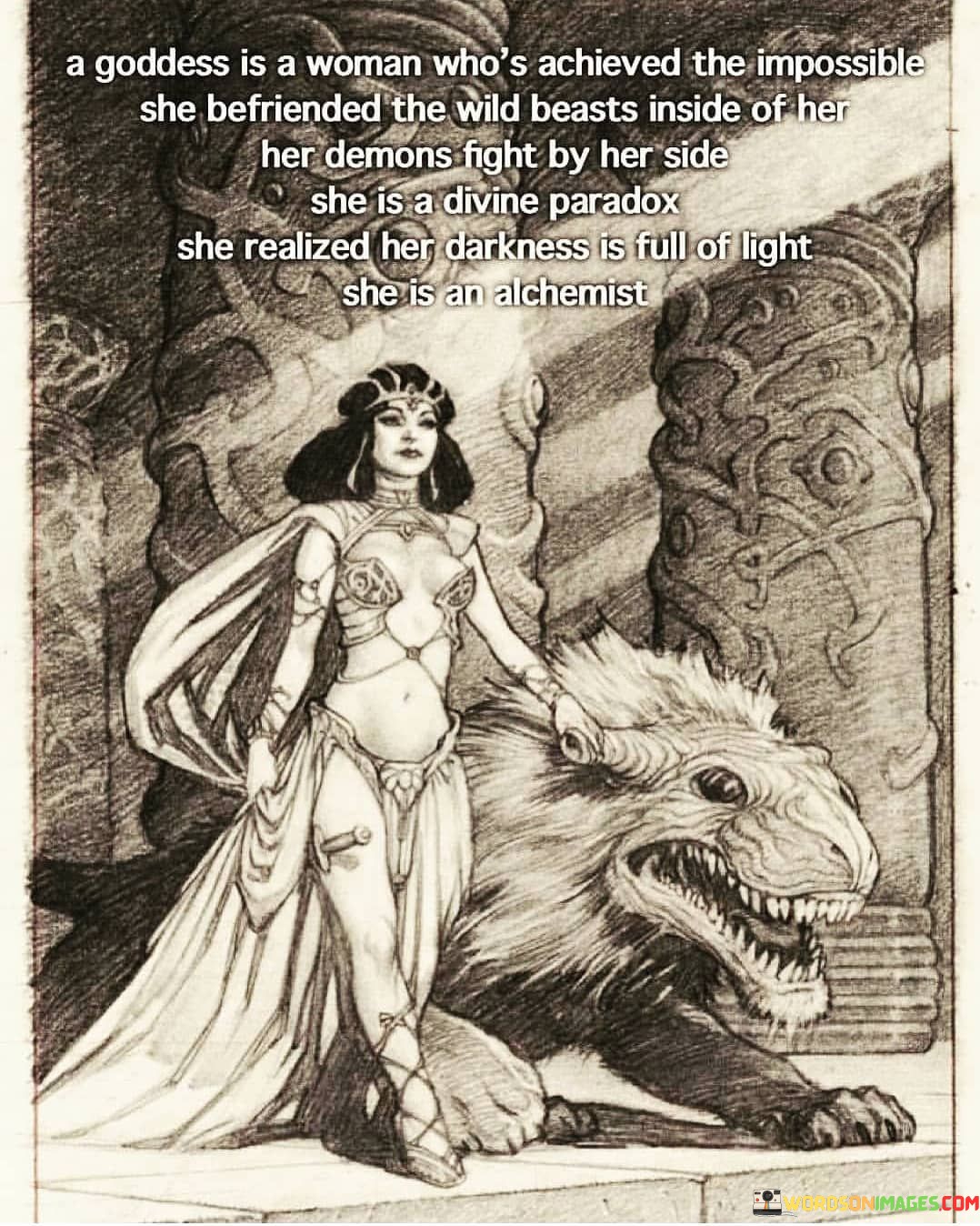 This powerful quote portrays a goddess as an embodiment of strength, self-awareness, and transformation. It celebrates a woman who has conquered the seemingly insurmountable, embracing both her light and darkness to become an alchemist of her own life. The statement "a goddess is a woman who's achieved the impossible" captures the essence of her resilience and ability to overcome challenges that may appear overwhelming to others. This goddess stands as a living testament to the human capacity to triumph over adversity and accomplish what others might deem unattainable.The phrase "she befriended the wild beasts inside of her" paints a vivid picture of her journey towards self-discovery and acceptance. Instead of suppressing her inner struggles and demons, she confronts them with courage and compassion, forming an alliance that strengthens her from within. This partnership with her inner wildness signifies her deep understanding of her emotions and insecurities, making her more in tune with her authentic self.The quote continues, stating that her demons now fight by her side. This symbolizes her transformation from a victim of her own struggles into a warrior who embraces her shadows, allowing them to become sources of empowerment and growth. Her recognition of her divine paradox acknowledges the duality of her nature—the coexistence of light and darkness, vulnerability and strength, imperfection and divinity.Moreover, she acknowledges that her darkness is full of light, revealing her profound wisdom and understanding that life's challenges hold the potential for growth and enlightenment. She sees the beauty in her own complexities, finding strength in vulnerability and learning from life's trials.Ultimately, she is an alchemist—a transformative force in her own life. This term suggests her ability to transmute pain into wisdom, fears into courage, and adversity into opportunities. By embracing her journey of self-discovery and self-empowerment, she becomes an inspiration to others, encouraging them to embrace their own divine paradoxes and transform their lives through the power of self-acceptance and growth. The quote, thus, serves as a celebration of the indomitable spirit of women and the potential for transformation that lies within each individual.