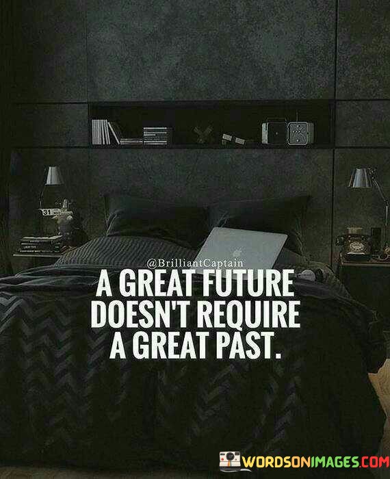 This quote means that a successful future doesn't depend on having a remarkable past. It suggests that even if you've faced challenges or mistakes in the past, you can still create a positive and successful future. Your past doesn't define your potential for greatness.