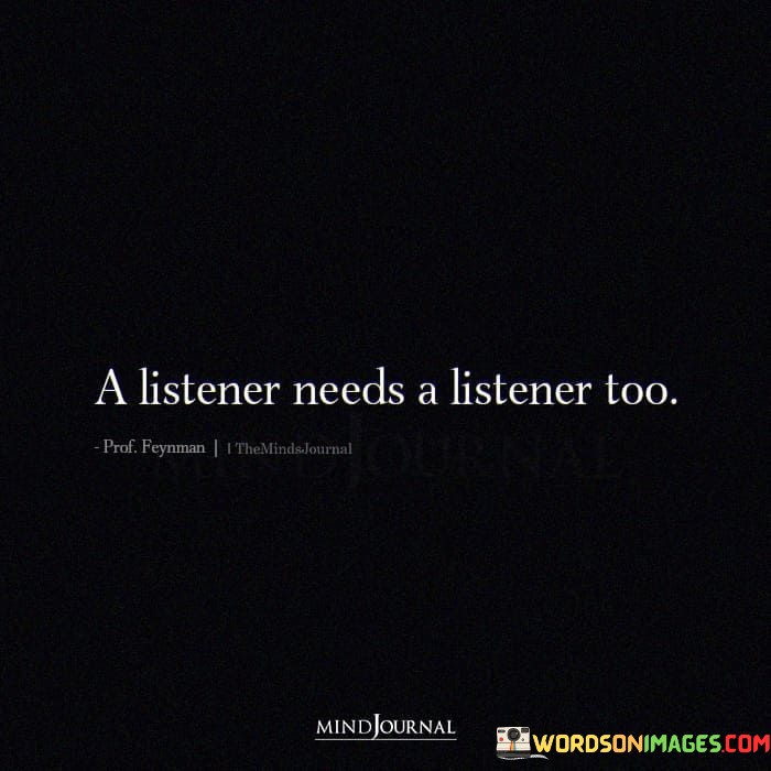 This quote, "A Listener Needs A Listener Too," means that even someone who often listens to others also requires someone to listen to them. In simpler terms, if you're the type of person who listens to other people's problems, it's important for you to have someone who listens to your concerns as well. It's like a two-way street of listening.