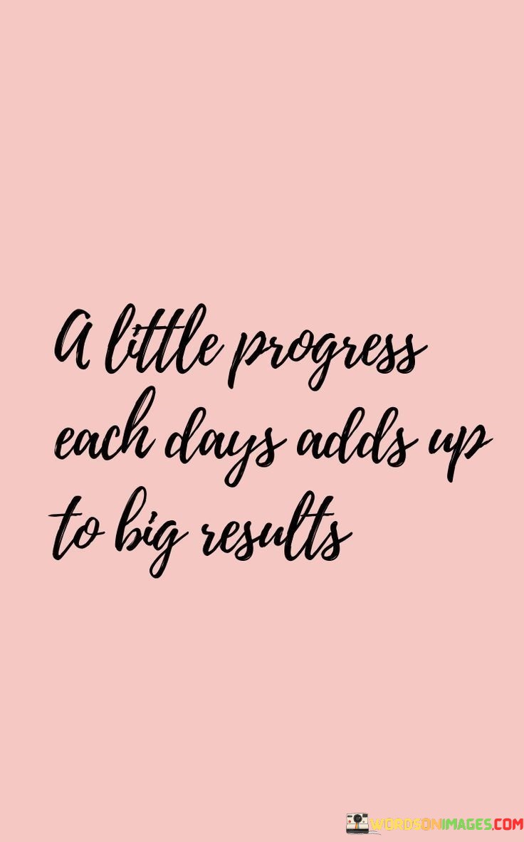 This quote emphasizes the cumulative nature of progress. In the first part, "a little progress each day," it highlights consistent effort. The second part, "adds up to big results," suggests that small steps contribute to significant achievements over time.