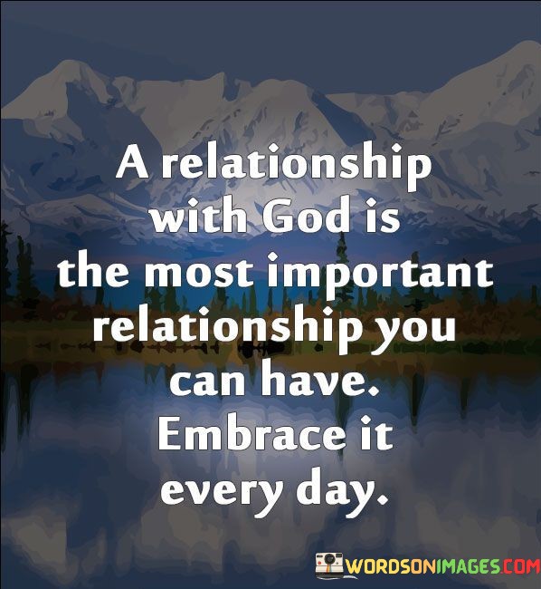The quote "A relationship with God is the most important relationship you can have; embrace it every day" underscores the paramount significance of one's spiritual connection with a higher power. It implies that this relationship should take precedence over all other relationships because it provides a profound sense of purpose, guidance, and moral grounding in life. By prioritizing this connection, individuals can draw upon a wellspring of strength, solace, and wisdom to navigate the complexities of existence.