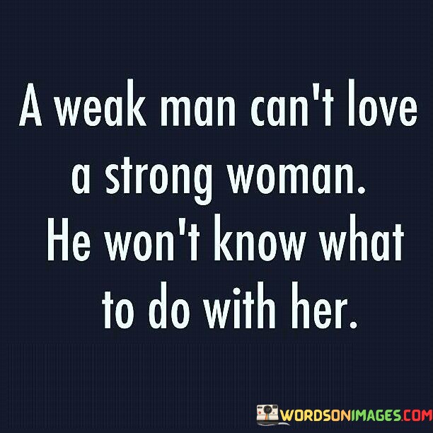 The quote "A weak man can't love a strong woman; he won't know what to do with her" reflects on the potential challenges that can arise in relationships where there is a significant power imbalance or a mismatch in personal strengths and characteristics. It suggests that a weak man, lacking confidence, self-assurance, or a sense of purpose, may struggle to truly appreciate and support a strong woman. The quote points out that such a man may be intimidated by her strength, unsure of how to handle her independence, and may feel inadequate in comparison. It highlights the importance of compatibility, understanding, and mutual empowerment in fostering healthy and fulfilling relationships.The quote implies that a weak man, lacking in personal strength or a strong sense of self, may struggle to understand or value the qualities that make a woman strong. He may feel overwhelmed or insecure in the face of her confidence, independence, and assertiveness. This disparity in strengths can lead to tension, misunderstandings, and an inability to connect on a deeper level.Furthermore, the quote suggests that a weak man may be ill-equipped to provide the necessary support and understanding that a strong woman requires. He may feel threatened by her accomplishments, aspirations, and independence, unable to offer the level of emotional, intellectual, or personal support that she needs. This can result in a lack of fulfillment and dissatisfaction for both individuals involved.In summary, the quote "A weak man can't love a strong woman; he won't know what to do with her" suggests that a significant power imbalance or a mismatch in personal strengths can pose challenges in relationships. It highlights the potential for a weak man to feel intimidated, inadequate, or uncertain in the presence of a strong woman. The quote emphasizes the importance of compatibility, understanding, and mutual empowerment in fostering healthy and fulfilling relationships. It is crucial to recognize that relationships are diverse and multifaceted, and the strength or weakness of individuals cannot solely determine the success or failure of a partnership.