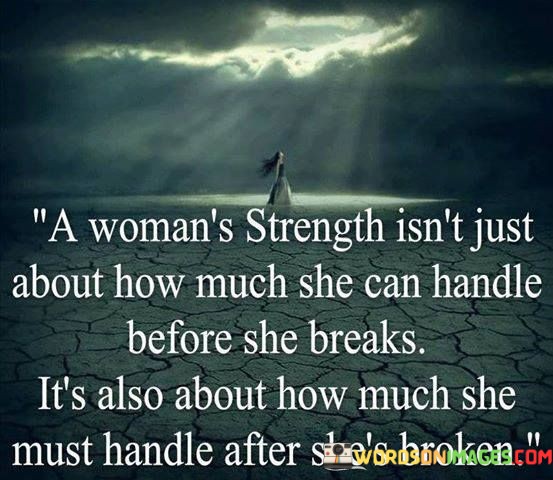 The quote "a woman's strength isn't just about how much she can handle before she breaks; it's also about how much she must handle after she's broken" delves into the profound resilience and endurance that women exhibit in the face of adversity and challenges. The phrase "a woman's strength" celebrates the inner power and courage that women possess, acknowledging that their strength goes beyond merely withstanding difficulties without breaking. It emphasizes that true strength is revealed in their ability to confront and overcome challenges even after experiencing moments of vulnerability or brokenness. The quote highlights the notion that women often encounter numerous trials throughout their lives, and their strength lies in how they rise above these hardships and continue to navigate life with determination and fortitude.