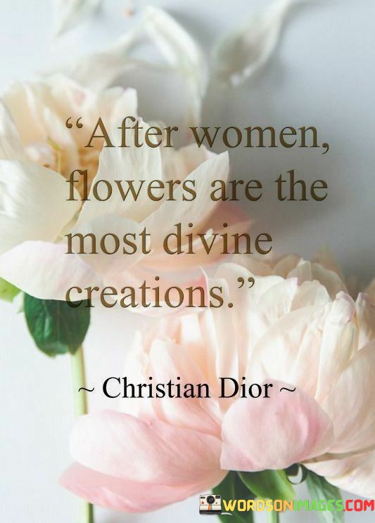 The quote "After women, flowers are the most divine creations" expresses the notion that women occupy the highest pedestal of divine existence, while flowers hold a close second place. It suggests that women possess an unparalleled beauty, grace, and allure that is only surpassed by the enchanting charm of flowers. The quote pays homage to the divine qualities inherent in women, acknowledging their ability to captivate hearts and minds with their presence. It further draws a parallel between women and flowers, both being symbols of purity, elegance, and the extraordinary wonders of nature. Like women, flowers possess a mesmerizing aura, captivating us with their vibrant colors, delicate petals, and sweet fragrances. The quote celebrates the exquisite nature of femininity, highlighting the profound impact that women and flowers have on our emotions and aesthetic appreciation. It serves as a reminder of the remarkable creations that bring beauty and joy to our lives.