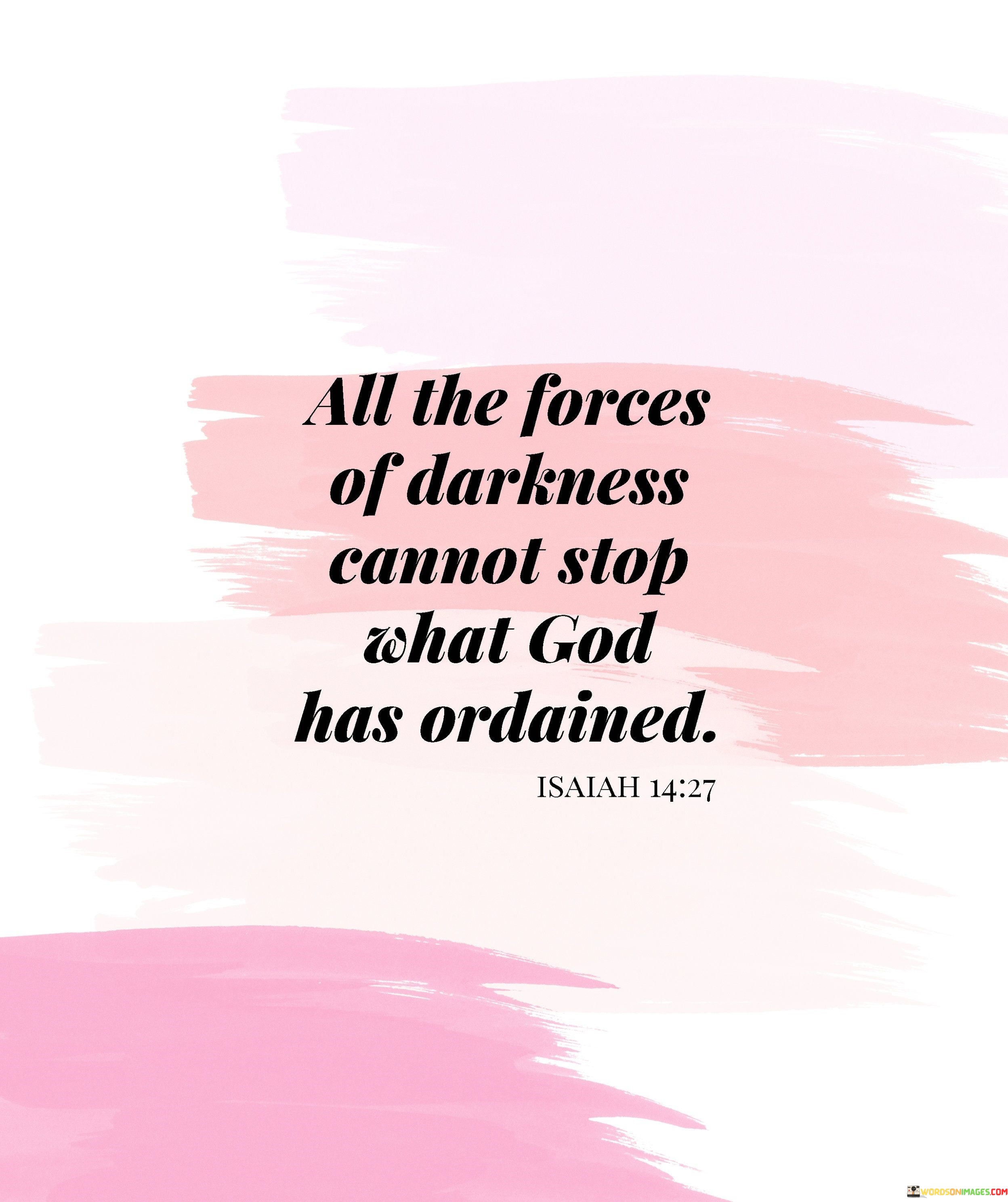 This quote carries a message of divine invincibility and the ultimate triumph of God's will. In a single sentence, it suggests that no matter how powerful the forces of darkness may be, they cannot thwart or prevent what God has ordained or decreed.