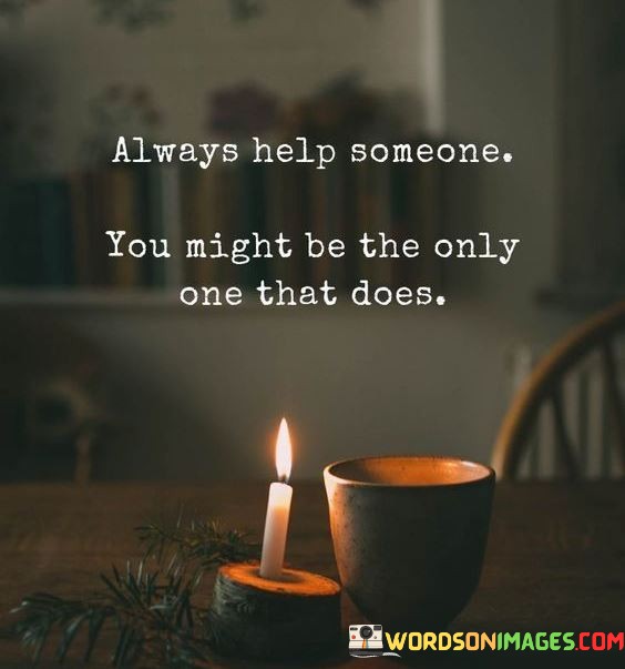 The quote, "Always help someone. You might be the only one that does," carries a profound message about the significance of kindness, compassion, and the potential impact of our actions on others' lives. It reminds us of the power of small acts of kindness and the difference they can make in someone's life. By extending a helping hand, we not only provide practical assistance but also offer emotional support and a sense of connection. The quote serves as a reminder that even the simplest acts of kindness can have a profound and lasting impact on someone who may be facing challenges or feeling isolated. It encourages us to be mindful of the opportunities to help others and to embrace our role as agents of positive change in the lives of those around us. At its core, the quote celebrates the transformative power of helping others. It emphasizes the importance of empathy and compassion in our interactions with those in need. By offering our assistance, we validate their struggles and show them that they are not alone in facing their challenges. In a world where many individuals may feel isolated or unheard, the act of helping can foster a sense of connection and belonging. Moreover, the quote speaks to the significance of being proactive in offering help. Often, people may be hesitant to seek assistance, even when they are struggling. By taking the initiative to help, we create a safe and supportive environment that encourages others to reach out and share their needs. Furthermore, the quote highlights the potential ripple effect of our actions. When we help someone, it not only benefits the individual directly but also sets an example for others to follow. Small acts of kindness can inspire a chain reaction of compassion and generosity, fostering a sense of community and collective responsibility for the well-being of others. In conclusion, the quote "Always help someone. You might be the only one that does" serves as a poignant reminder of the power of kindness and compassion. It encourages us to be proactive in extending a helping hand to those in need, recognizing that even the simplest acts of kindness can have a profound and lasting impact. By offering our assistance and support, we create a sense of connection and belonging for those facing challenges, and we inspire a chain reaction of compassion that can transform lives. The quote calls on us to embrace our role as agents of positive change and to be mindful of the opportunities to make a difference in the lives of others. Ultimately, it celebrates the transformative potential of helping others and the profound impact that our actions can have on fostering a more compassionate and caring world.