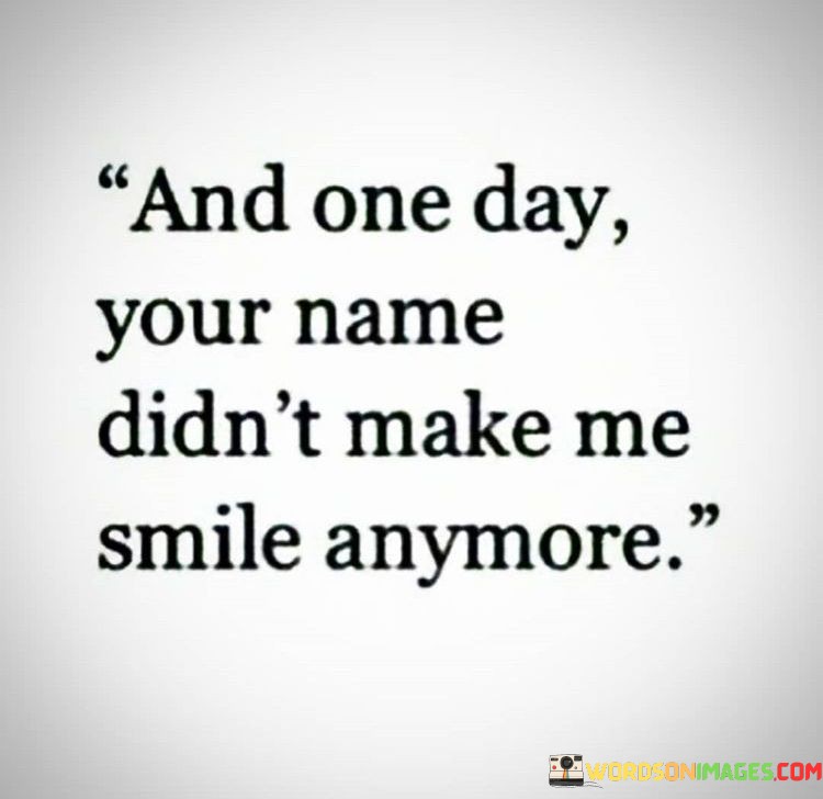 The quote speaks to the changing nature of emotions. "One day your name" implies a shift in feelings. "Didn't make me smile anymore" signifies the loss of joy. The quote conveys the evolution of emotions, from happiness to a more neutral or negative state.