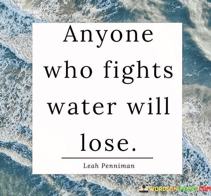 The quote "Anyone Who Fights Water Will Lose" conveys a fundamental truth about nature and life. It means that when you try to resist or go against the natural forces or circumstances, you are likely to face difficulties and setbacks, ultimately leading to failure.