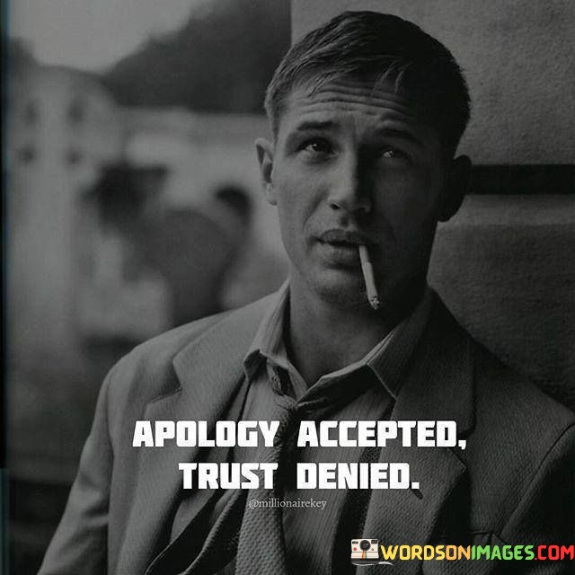 The quote's essence can apply to various situations. It underscores the importance of actions matching words. In personal and professional interactions, rebuilding trust requires consistent integrity. Accepting apologies signifies openness, but trust denied reflects the need for a genuine transformation to restore faith in someone or something.