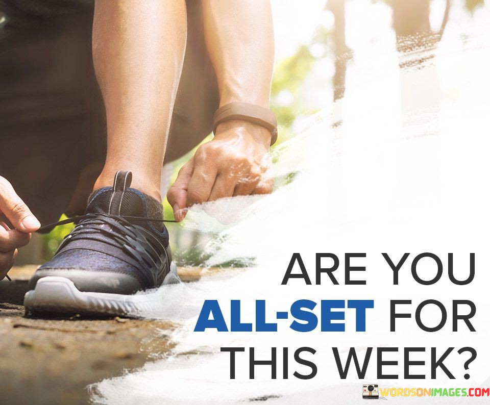 Ready to conquer the upcoming week? This quote is a friendly inquiry about your preparedness for the week ahead. It suggests a sense of readiness and anticipation for the challenges and opportunities that the week will bring. It's like asking if you've equipped yourself mentally and practically for what's to come.