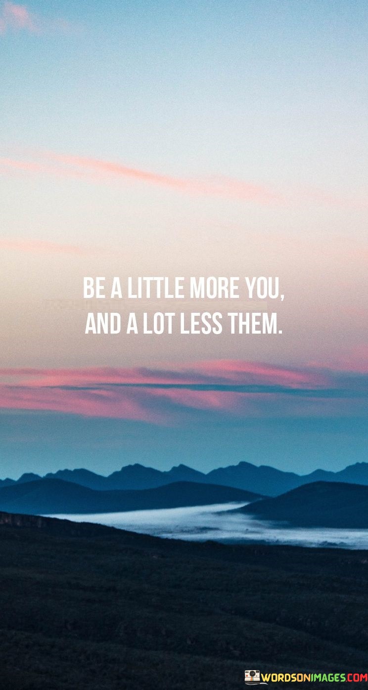 The quote "Be a little more you and a lot less them" encapsulates a profound message about the significance of authenticity in our lives. It urges us to shed the facades we often wear to fit into societal molds and instead embrace our true selves. This advice encourages self-discovery and self-expression, emphasizing the importance of staying true to our individuality.