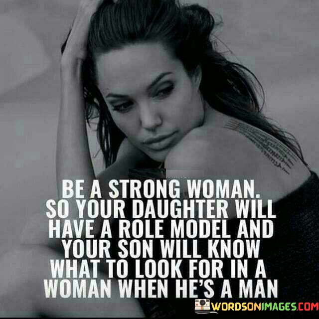 This quote highlights the importance of being a strong woman not only for oneself but also for the impact it has on future generations. It suggests that by embodying strength, resilience, and self-assurance, a woman becomes a role model for her daughter and sets a standard for what her son should value in a woman when he grows into a man. By being a strong woman, she shows her daughter that she can be independent, confident, and capable of achieving her goals. She becomes a source of inspiration, demonstrating that women are capable of breaking barriers and pursuing their dreams. At the same time, she provides her son with a positive example of the qualities he should seek in a partner. Through her strength, she teaches him to value a woman who is confident, assertive, and empowered. By witnessing the strength and resilience of his mother, he learns to appreciate and respect women who possess these qualities.