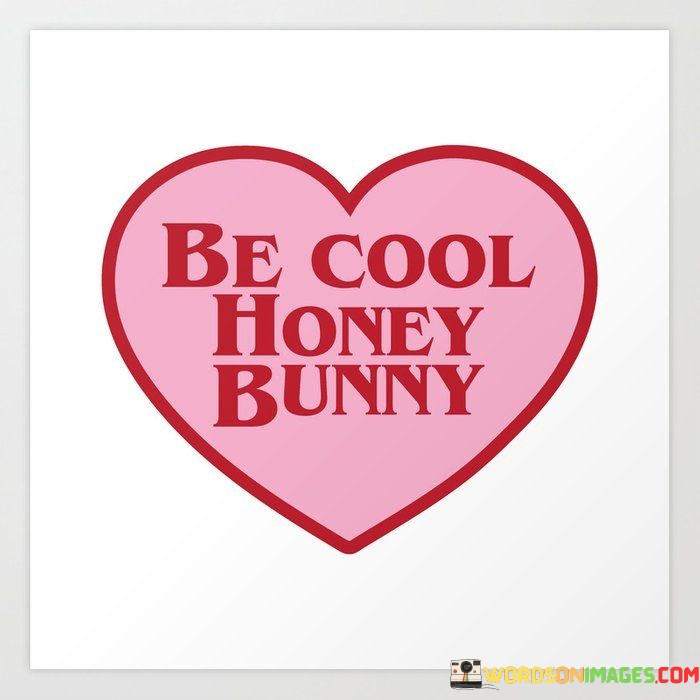 The quote "Be Cool Honey Bunny" carries a light-hearted and informal message. It's a playful way of telling someone to relax, stay calm, and maintain a composed and easygoing attitude, much like the persona of a "honey bunny."