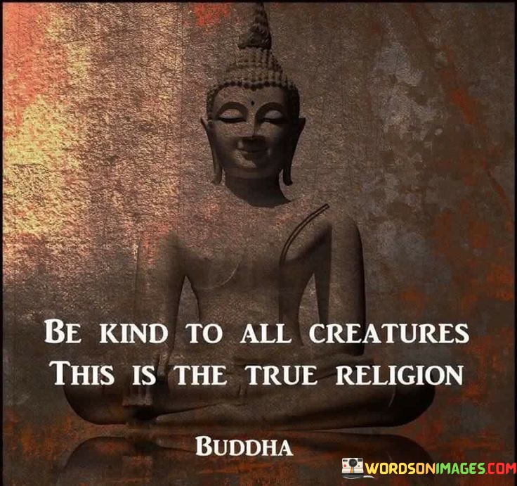 This quote conveys a profound message about the significance of kindness and compassion towards all living beings. In a single sentence, it suggests that true religion is not defined by rituals or doctrines but by the practice of treating all creatures with kindness.