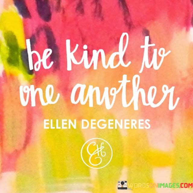 The quote "Be Kind To One Another" conveys a fundamental message of compassion and empathy. It encourages people to treat each other with kindness and consideration, emphasizing the importance of fostering positive and harmonious relationships in our interactions with others.