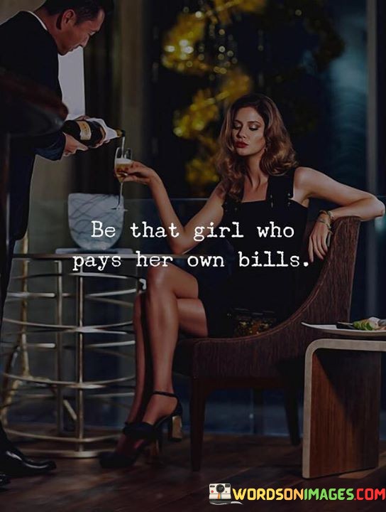 This quote encourages women to be financially independent and self-reliant. It suggests being the kind of person who doesn't depend on others to cover expenses. Instead, take control of your finances and stand on your own feet. It's about empowerment, showing that women can handle their financial responsibilities confidently.