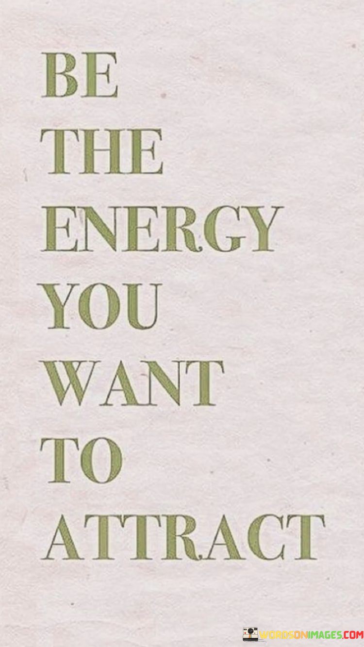 Your energy sets the tone for interactions. In this context, the quote emphasizes the role of your personal energy in shaping your interactions and relationships. It implies that if you want positivity and kindness from others, you should first embody those qualities in your own demeanor. By doing so, you create an environment where such energies thrive.