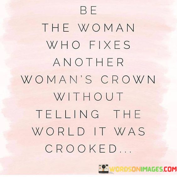 This quote encapsulates the essence of empathy, support, and sisterhood among women. It encourages women to uplift and empower each other discreetly and selflessly. The metaphorical "crown" symbolizes a woman's worth, confidence, and self-esteem. By "fixing another woman's crown," it means offering help, encouragement, or guidance to someone who might be going through a difficult time or struggling with their self-belief. The phrase "without telling the world it was crooked" emphasizes the importance of maintaining confidentiality and not seeking recognition for our acts of kindness. It encourages genuine altruism and reinforces the idea that true empowerment lies in quietly supporting one another without any ulterior motives. It highlights the strength that comes from building each other up instead of tearing one another down, fostering a community of understanding and compassion. Ultimately, this quote reminds us of the power of solidarity and how small acts of kindness can have a profound impact on the lives of others, making the world a better and more supportive place for all women.